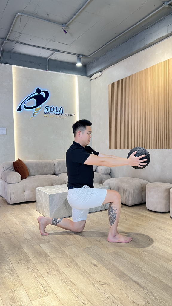 - Lunges with Rotation: Bước chân dài, xoay thân trên, cải thiện tính linh hoạt hông và cột sống. 3 hiệp, 8 lần mỗi bên.